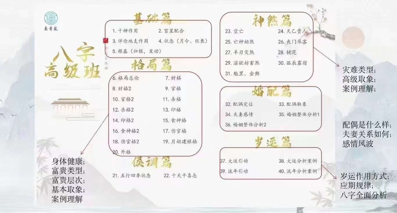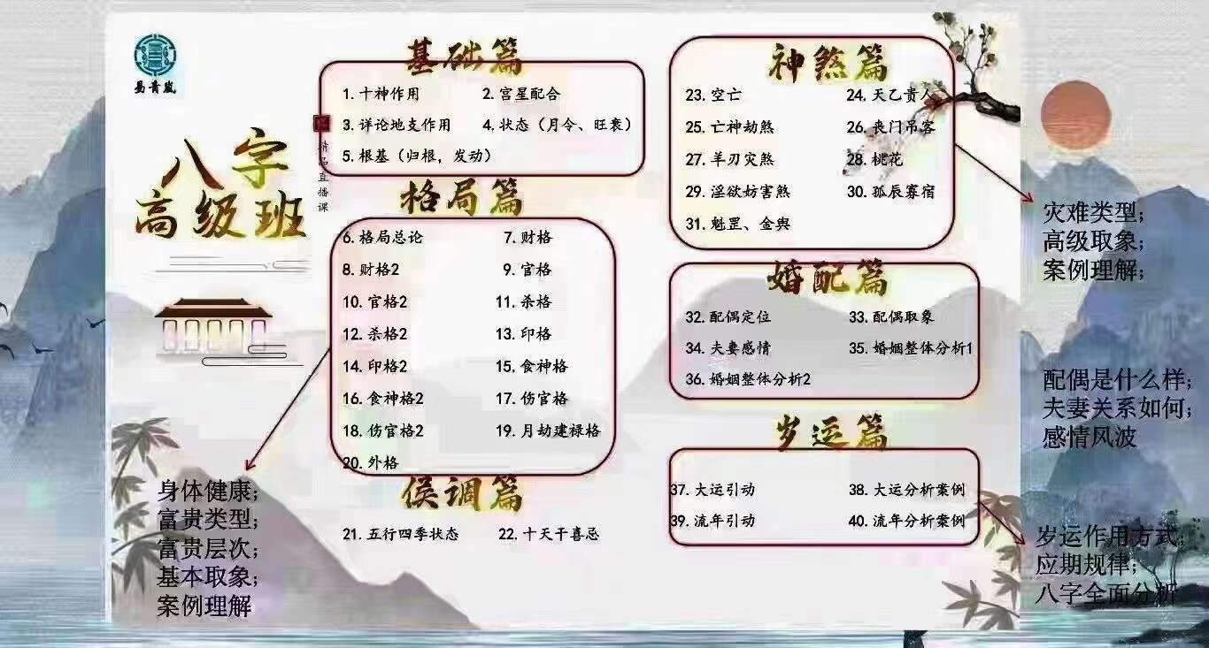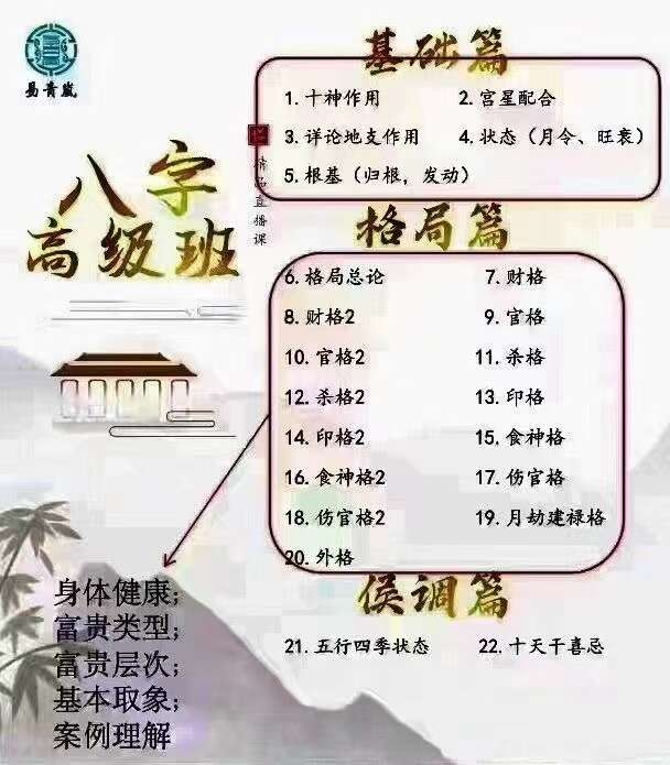 易青岚八字高级班视频+资料!!!岁运作用方式、应期规律、八字全面分析、大运引动、大运分析案例、流年引动、流年分析案例、岁运篇、基础篇、格局篇、候调篇、婚姻篇