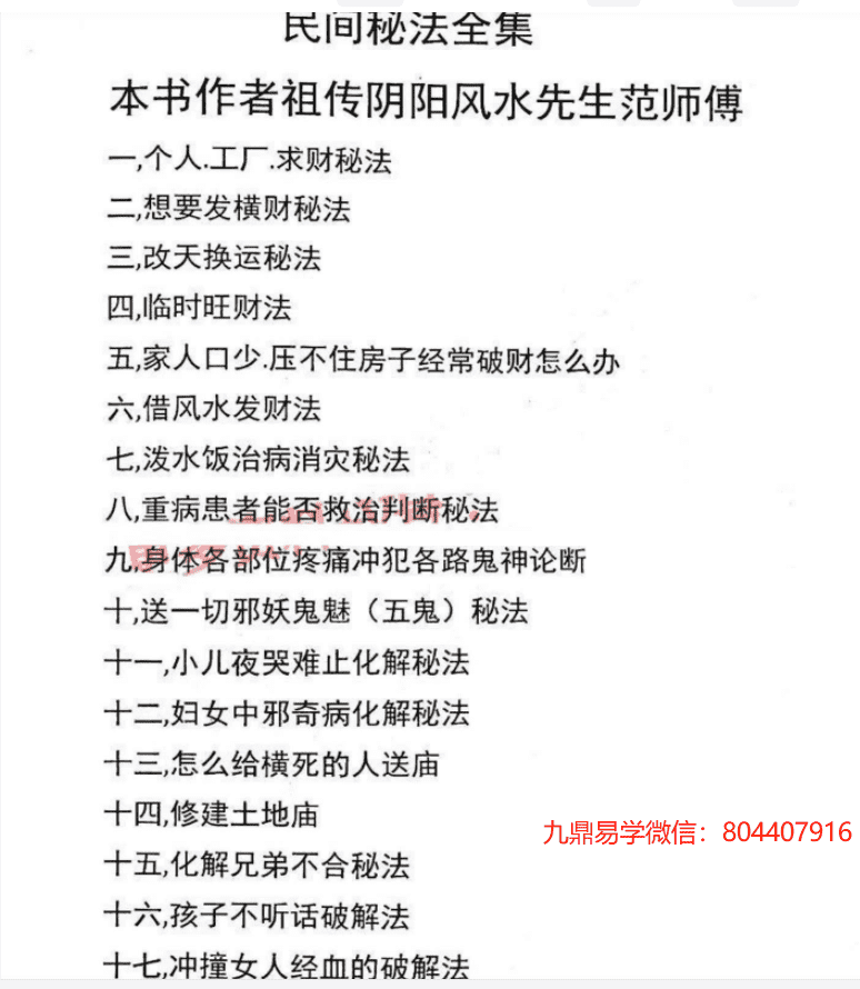 范师傅民间秘法集成.pdf,99页。包含79个秘法,范老师据说是祖传阴阳风水先生,不确定是否东北老大神,因为用了同一个封面,有的卖家直接冠名东北老大神,本站持保守的态度。