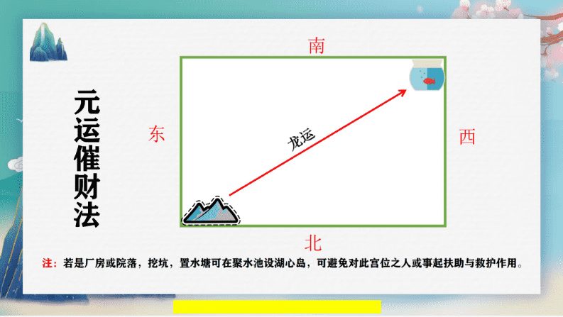 如八运(2004-2023年),民正为神,与之对冲方坤位为零神。正要神高,可假设山以承天运之气:零神要低,可设池水鱼缸之类,以地接龙之气,以财聚气。龙运东从北而来,一头抵坤到方,要有水喝才好。
