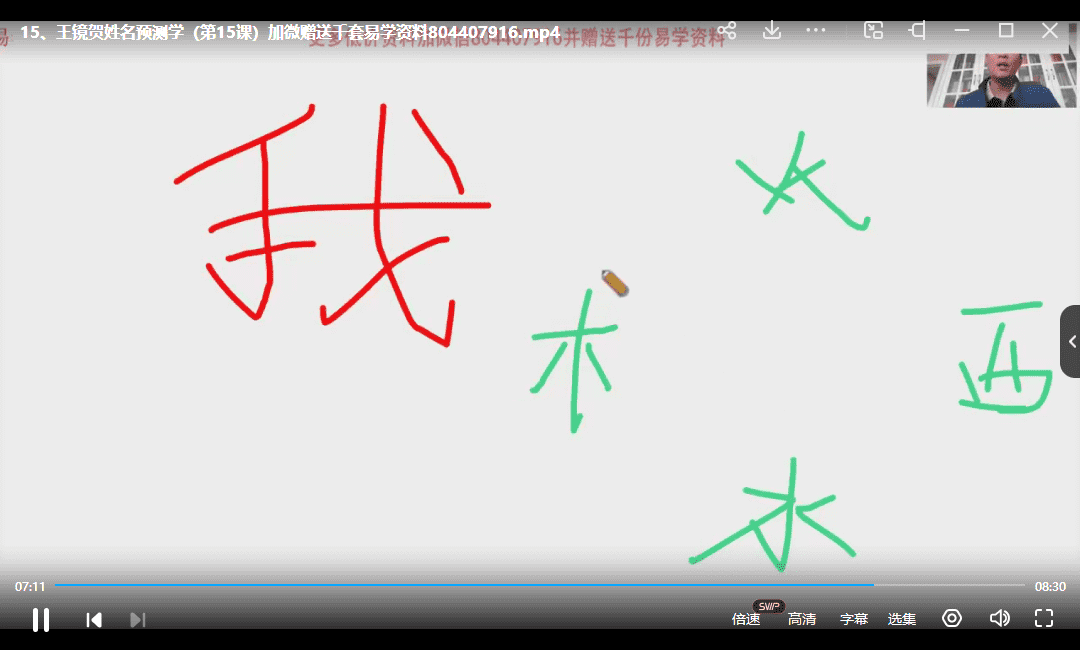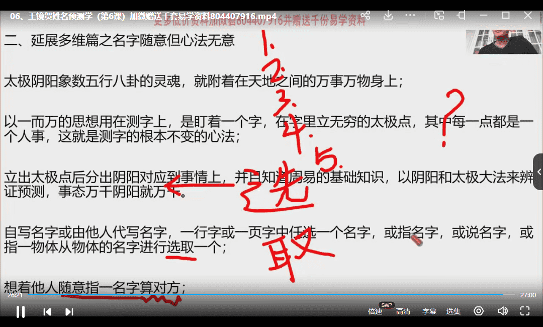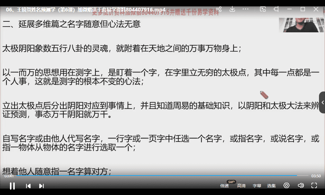 王镜贺姓名预测学 视频15集,直播讲解,视频上有文字描述,可以更好的去学习和记忆。围绕文字讲解,树立太极点,从而判断吉凶,理论偏向天机姓名学。