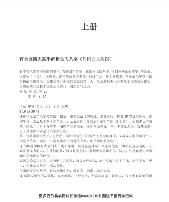 这本书没有从四柱八字基础知识讲起,而是直接研究高层次的东西——就是研究各个大师的思路框架。因为思路决定出路,格局决定高度。不研究实例,空头的理论说教,大家理解起来很难,所以这本书分上中下三册。上册,研究了当前全国知名的一些大师的案例,包括李涵辰、段建业、惭愧学人、王庆、阿财、杨清娟、胡一鸣、徐伟刚、蔡昔琼、凌雪衣、梁相润、独步中原、许西川、包双龙、郑民生、姚亚峰、孙海义等等,被易学圈公认的高手的八字案例。提到的这些人都是我比较尊重的高手,也是有一套完整的理论。百度一搜他们的易理知识到处都是,他们有学术精神,治学精神,这一点不敢否定。