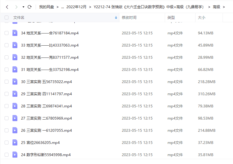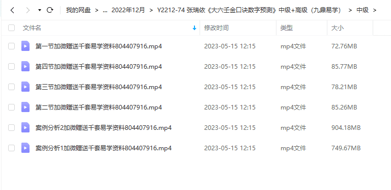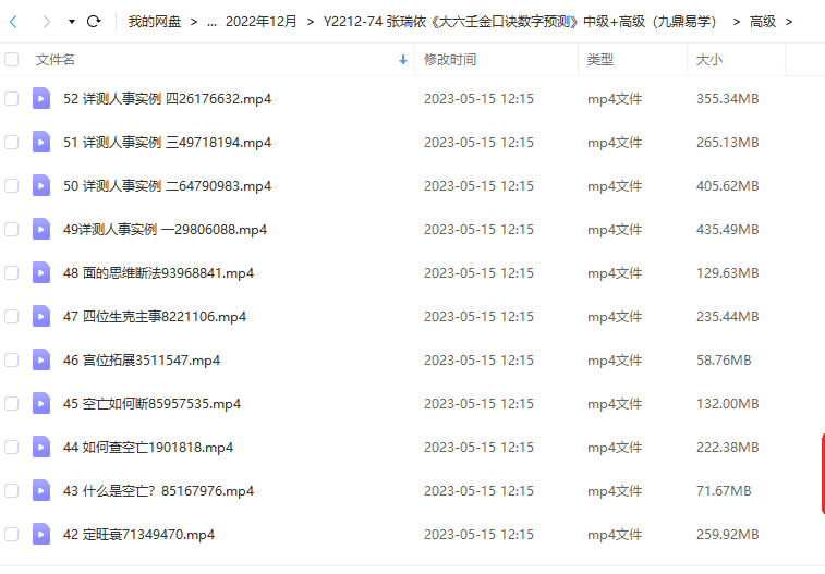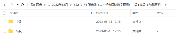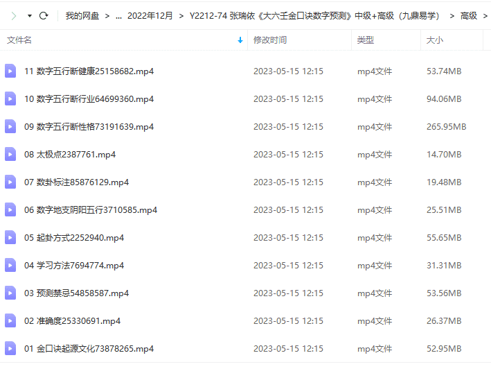 张瑞依《大六壬金口诀数字预测》中级+高级共58集视频,其中中级的话,应该是属于基础内容讲解,说是初级还正确一些。至于高级班到是内容相对更多,中级和高级内容都有讲解。