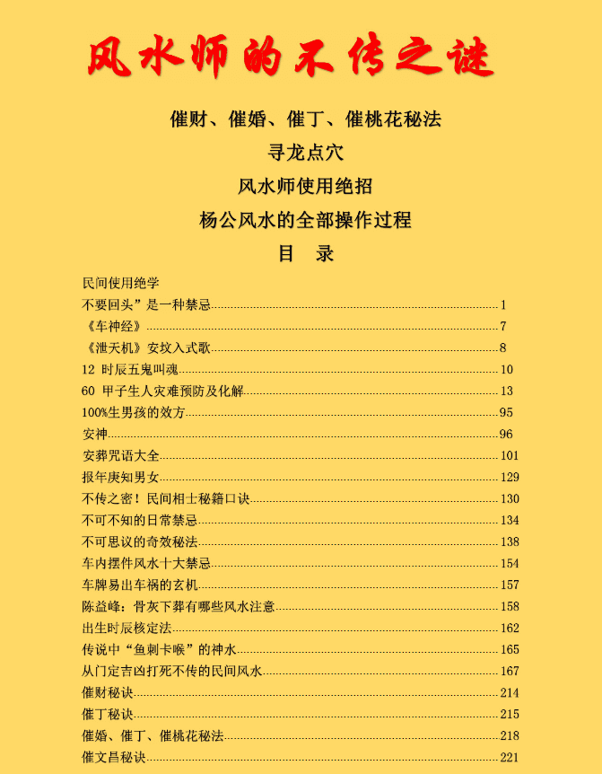 讲解催财,催丁,催婚,催桃花秘法,寻龙点穴绝招,杨公风水的全部操作过程。内容多多,各种秘法诀窍,民间秘术等均应有尽有。