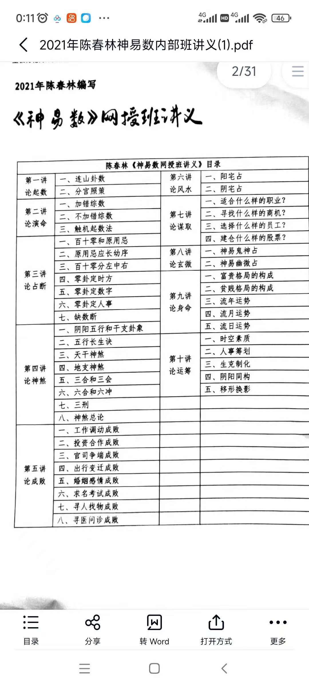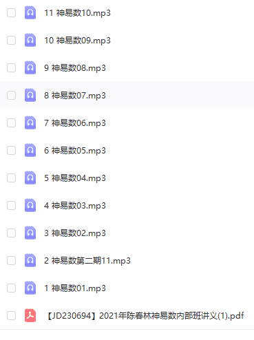 21集音频+2021年陈春林神易数内部班讲义pdf,31页。这个神易数据说是大定数的简化版本,为明朝的一个军师所作。预测功能强大,还具备应筹能力。