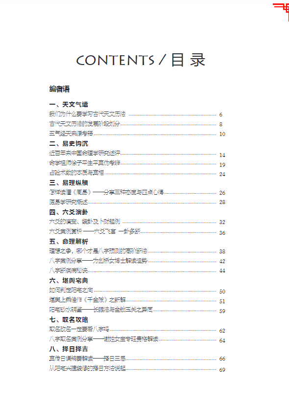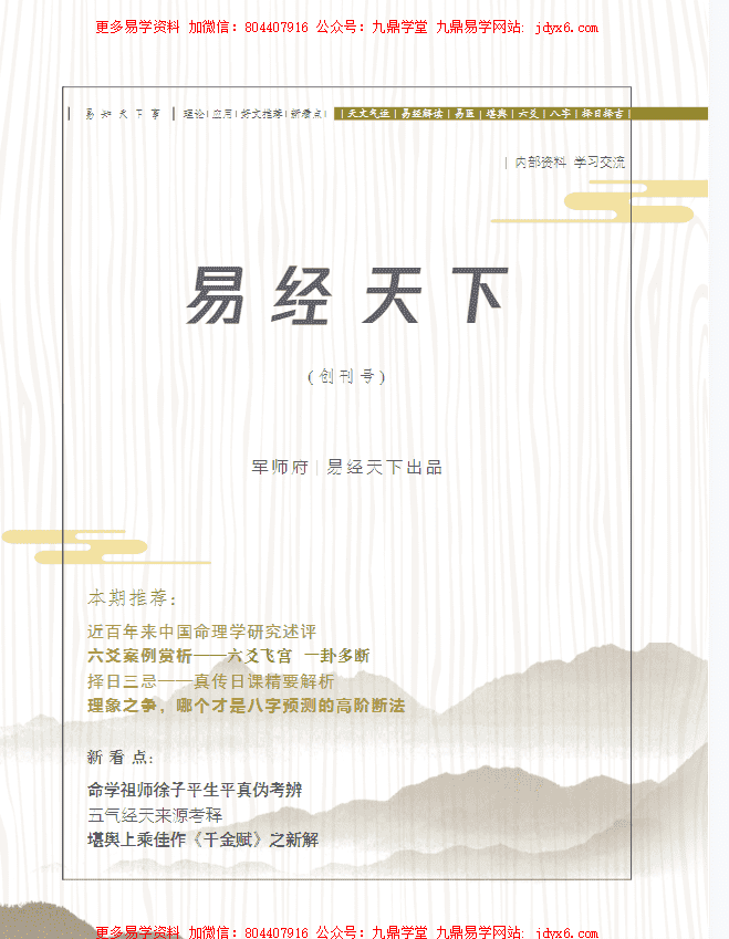 我们本着正本溯源、推已及人、理术并用的办刊宗旨,旨在打造-本富有综合性、开创性、学术性、实战性的易学精品期刊。本刊内容涵盖天文、气运易医、易理、易史、六爻、四柱、堪舆、择日等。所刊文章雅俗共赏,既突出经典的演变与发展,又阅释了术数、星历等各自的框架与脉络;既注重排盘起卦,传授高阶技法,又引实战案例融通,举-反三,以达到能类旁通之目的。总之,《易经天下》,体用分明,学术并重。作为周易术数爱好者,无论你是室基础学习者,还是经验丰富的专业人士,都值得收藏本刊。
