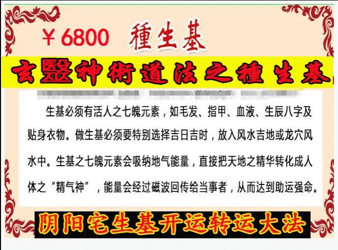 生基必须有活人之七魄元素,如毛发、指甲、血液、生辰八字及贴身衣物。做生基必须要特别选择吉日吉时,放入风水吉地或龙穴风水中。生基之七魄元素会吸纳地气能量,直接把天地之精华转化成人体之“精气神”,能量会经过磁波回传给当事者,从而达到助运强命。