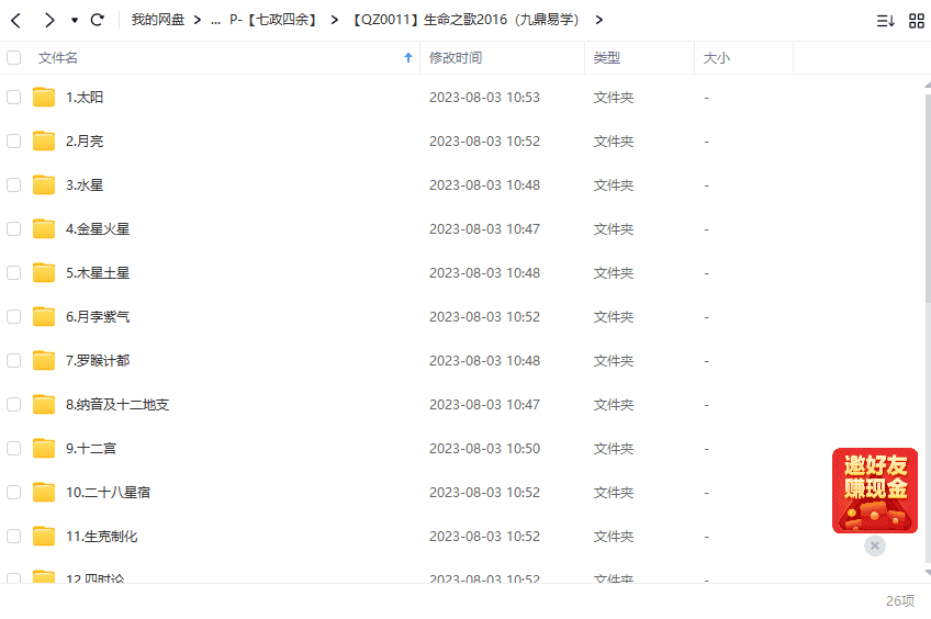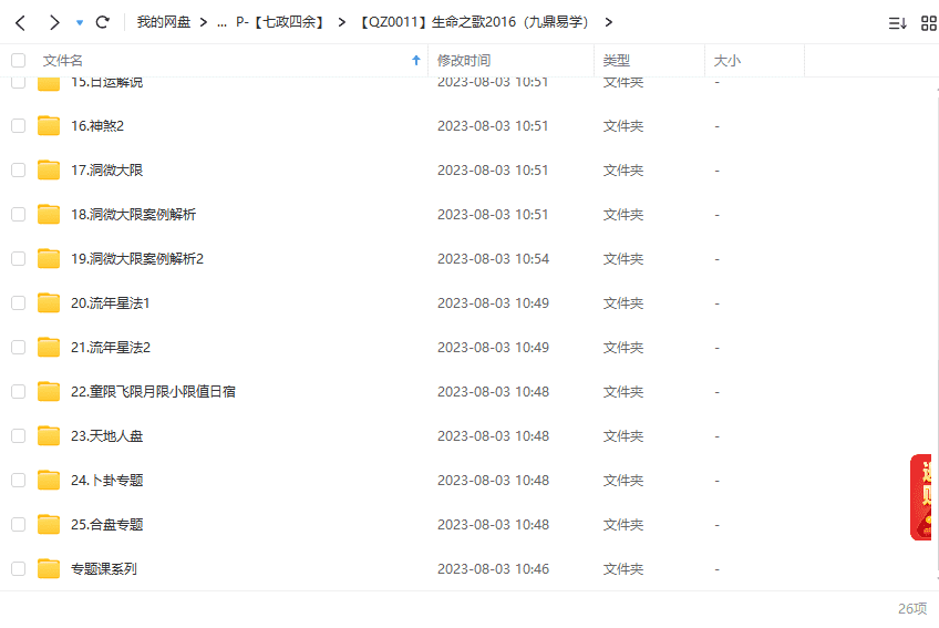 生命之歌2016年七政四余课程26课,含视频录音+文档。几乎每一课都有视频录音和文档记录,非常适合学习。除开第26课感情课只有文档没有视频。总体内容比较多,讲解得很有深度。