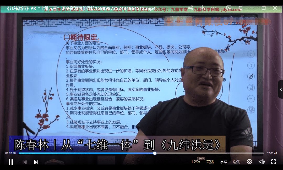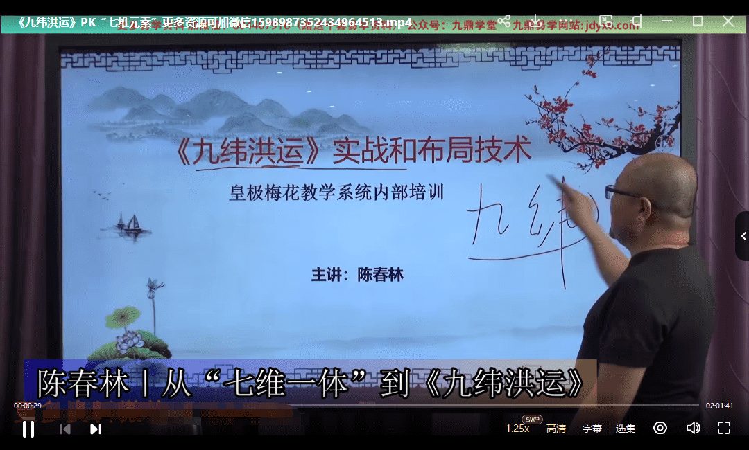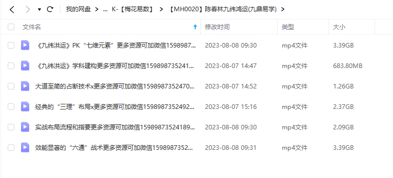 陈春林《九纬鸿运》视频课程6集,8个多小时。虽然只有6集,但容量大于1G的有4集,所以实际课程有8个多小时。此为旺财布局的大道至简之法,“九纬”——贯穿东西,九条大道,空间也。“洪运”——敬畏天命,时运照临,时间也。九纬三理(命理+相理+地理)六通(形象+服饰+香味+音律+用字+数码)这门学科体系,以简明易懂为宗旨,以功效显著为追求。想真正调理一个人的运势,必须要把握“三理”。三理是相对固定的抓手,“不易”也。六通是变化的,随着月令的变化而变化,“变易”也。我们要运用至简至易的方法去调理,那才是“简易”。