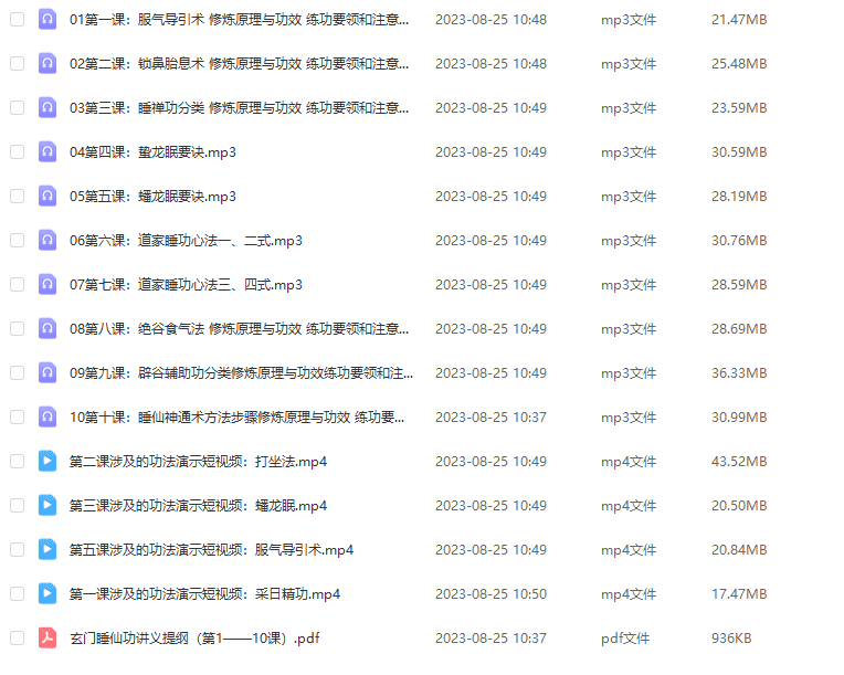 本课程设计为10节语直音播课,主内要容包括:揭服秘气导引术、锁鼻胎术息的修炼原与理功效,以及练要功领和注意事项,概睡述禅功分类,传授蛰龙眠蟠与龙眠要诀,以及家道睡功法心一、二、三、四式,还精典讲解绝谷气食法的修炼原与理功效以辟及谷辅助功类分等,最总后结睡仙神通术法方的步以骤及练功要诀。