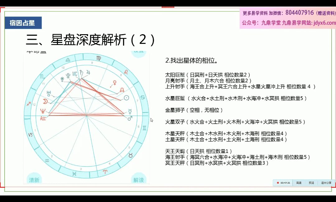 宿因占星初中阶入门+综合解盘(12个视频)+高阶推运5个视频共17个视频,没有资料,内容不少,入门课程也有很多网友关心的咨询问题,注入爱情,医疗,性格等。而高阶课程的话,则围绕推运讲解,让你明白每个时间节点所带来的影响和运势的起伏。
