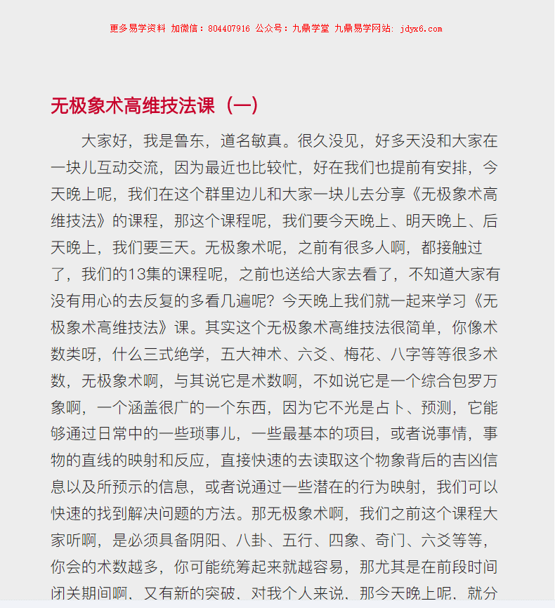 敏真道长鲁东老师无极象术录音+教材pdf。这个无极象术的话,脱胎于皇极万物数,据说兼容量很大,什么奇门,六壬,梅花易数等几乎是无术不容,你掌握的东西越多,则用无极象术得到的信息量越大,并且比梅花更快,不比奇门准确度差。