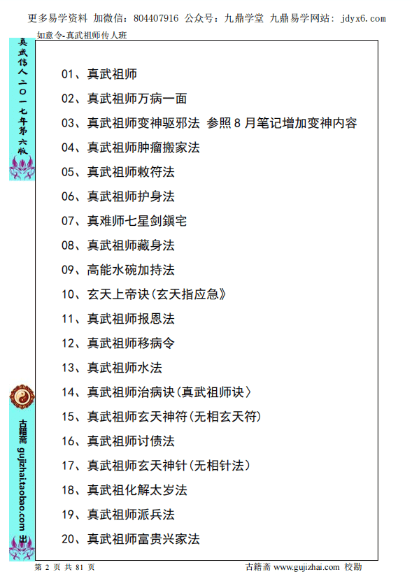姚远-财神体如意令真武祖师传人班讲义.pdf ,81页完整篇。讲解的内容很多,很多法围绕着催财富贵兴家,然后发现有不少内容和天医堂道法传授的法接近,比如葫芦罡,同时二者都在山东烟台出现,不知道属于变种还是一脉传承?因为看到网络上有人说姚远的三界查事法钓鱼式传授,但天医堂却是直接传授。然后之前网络曝出来的好像就是四十六页的这个是没有后面十八章内容的。46页后还有18章内容,也就是法多达几十个,后面的多为各式令法,咱这个是完整完结的