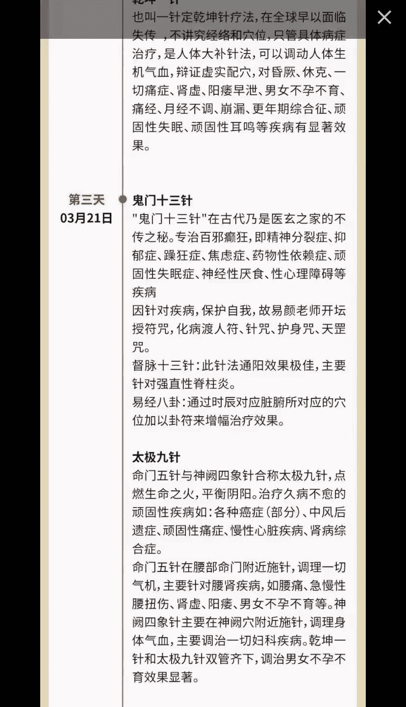 本研习班一一解上读古针法,课有程理(思路、注穴精解)有方(针方、灸方)有药(药方)、有符(化渡病人)、有咒、修功德、练天先功法,主要治阳疗虚、晕厥、一切痛症、肾虚、各脑类瘫、脑梗、结石类、阳微早歇、男不女孕不育、痛经、月经不调宫子瘤、卵囊巢肿、癫痫、各种肿瘤(部分癌症)、痛风、强直性柱脊炎、高血压、高血脂、糖尿病、精神裂分症、抑郁症、强迫症顽等固型难疑杂病及后产修复、美等容等