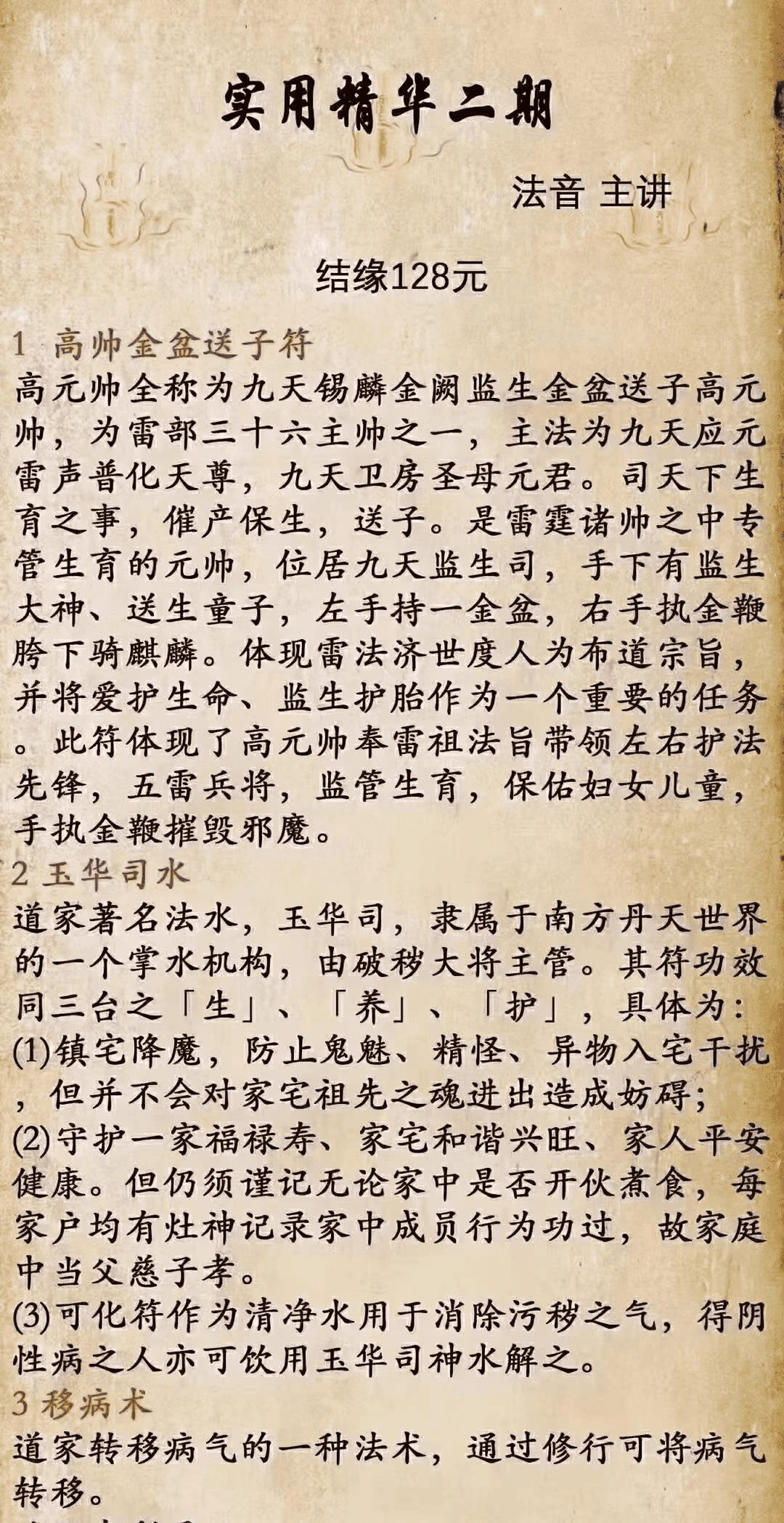 1. 高帅金盆送子符 高元帅全称为九天锡麟金阙监生金盆送子高元帅,为雷部三十六主帅之一,主法为九天应元 雷声普化天尊, 九天卫房圣母元君。司天下生育之事,催产保生,送子。是雷霆诸帅之中专 管生育的元帅, 位居九天监生司, 手下有监生大神、送生童子, 左手持一金盆, 右手执金鞭 胯下骑麒麟。体现雷法济世度人为布道宗旨,并将爱护生命、监生护胎作为一个重要的任务。 此符体现了高元帅奉雷祖法旨带领左右护法先锋,五雷兵将,监管生育,保佑妇女儿童,手 执金鞭摧毁邪魔。