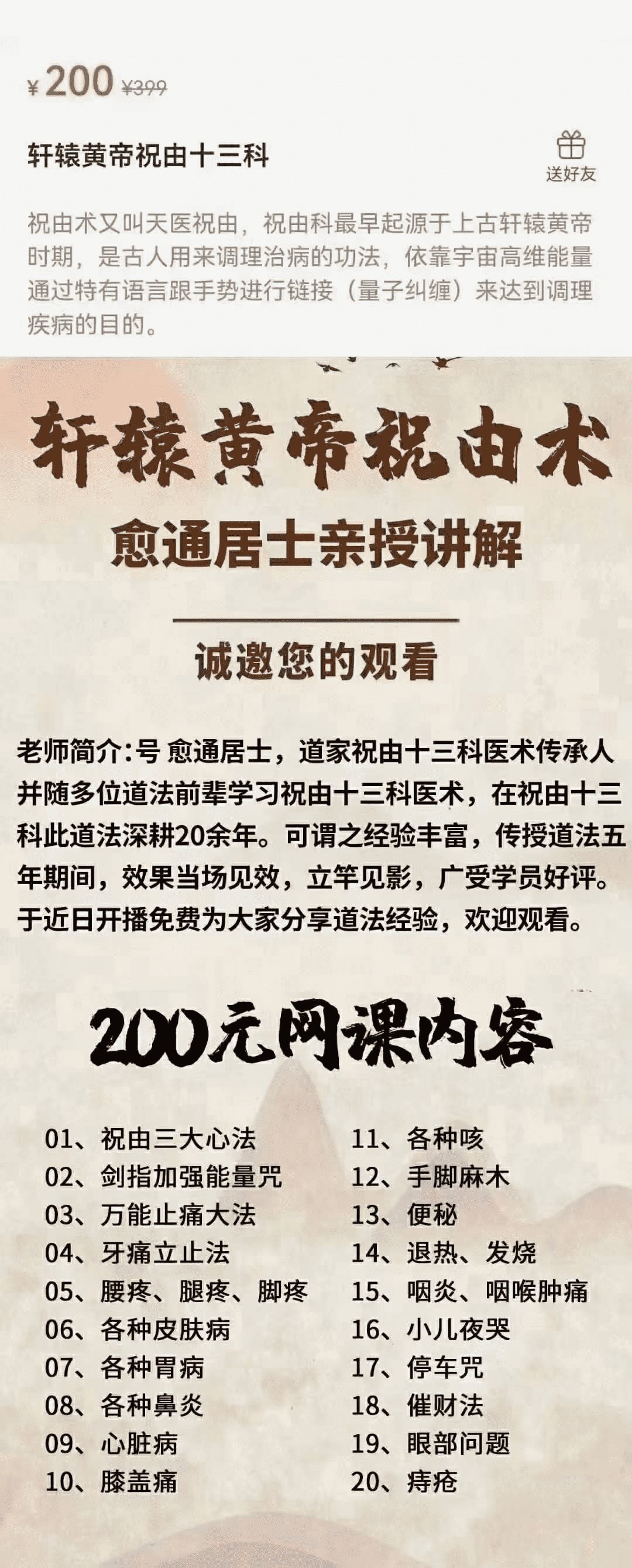 轩辕黄帝祝由十三科 视频+资料,祝由术又叫天医祝由,祝由科最早起源于上古轩辕黄帝时期,是古人用来调理治病的功法,依靠宇宙高维能量通过特有语言跟手势进行链接(量子纠缠)来达到调理疾病的目的。