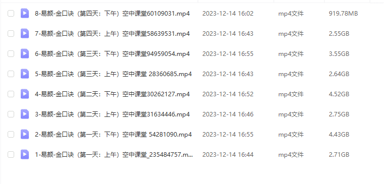 【空中课堂】易颜-道脉传承之上古秘术金口诀8集视频。注意,虽然只有8集视频,但容量较大,大于34G,所以内容并不少。
