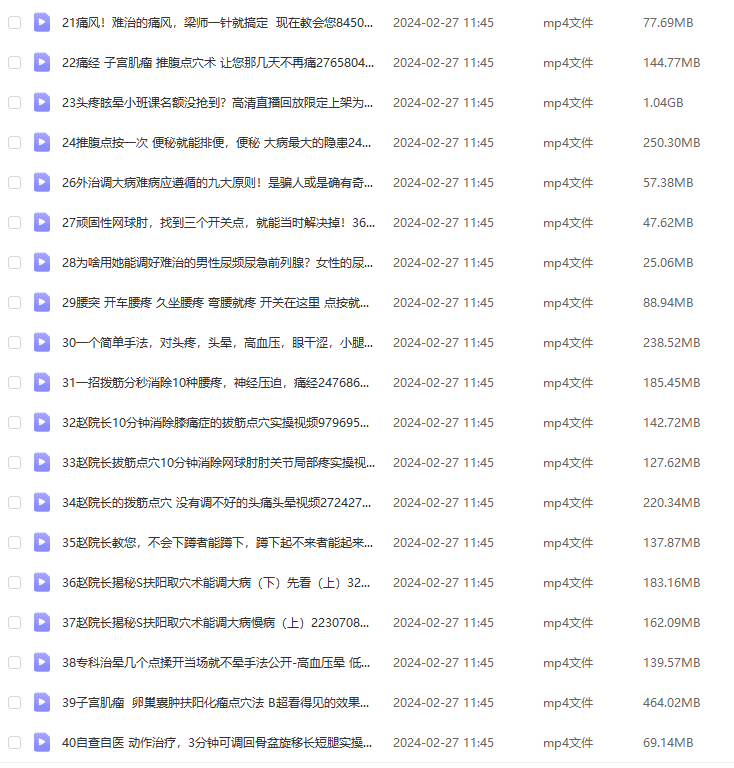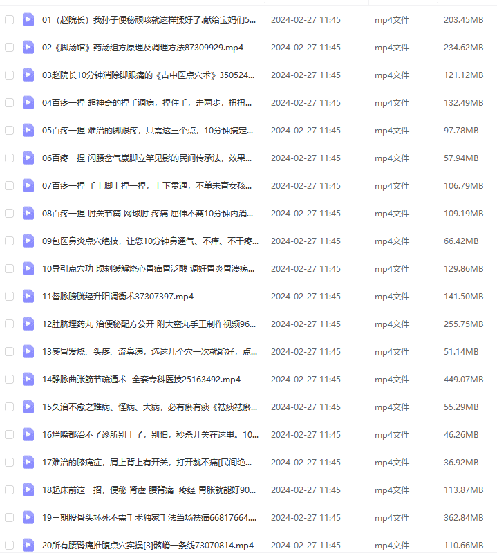 赵院长百病一捏手法绝技视频第二套视频40集,10个小时讲解。目前共有两套百病一捏手法绝技视频,网络热度不错,很多人均在找本套课程。注意,第25集已经被百度网盘判定为违规内容,所以这个视频已经被删除,只有39集了,介意的请不要下载。需要第一套的可以看这里:赵院长百病一捏手法绝技视频18集