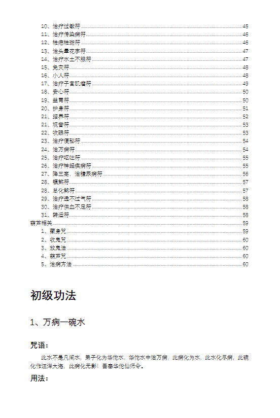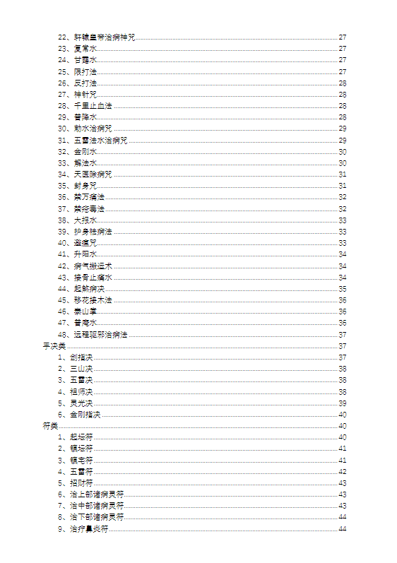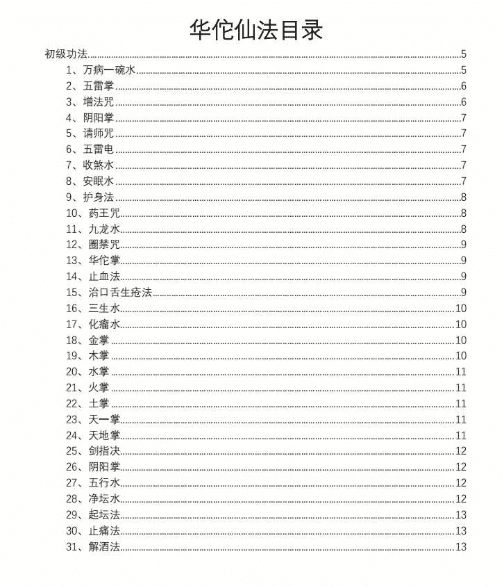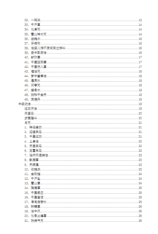 1、万病一碗水2、五雷掌3、增法咒4、阴阳掌5、请师咒6、五雷电7、收煞水8、安眠水9、护身法10、药王咒11、九龙水12、圈禁咒13、华佗掌14、止血法15、治舌口生疮法16、三生水17、化瘤水18、金掌19、木掌20、水掌21、火掌22、土掌23、天一掌24、天地掌25、剑指决26、阴阳掌27、五行水28、净坛水29、起坛法30、止痛法31、解酒法32、一阳决33、千斤掌34、化身咒35、雪神山水咒36、迷魂水37、牙疼咒38、治儿婴惊吓夜间泣哭惊叫39、空中取药法40、封印掌41、千里驱邪掌42、千里伤人掌43、增法咒44、梦中事查法45、通灵水46、问事咒47、接骨水48、妇科金千丹49、克癌丹
