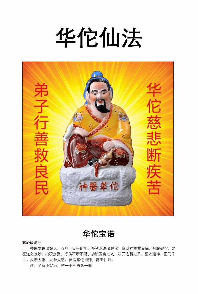 1、神接坛功2、迎接兵马3、千里过功4、上身法5、天兵医马6、五雷兵马7、治疗风湿病法8、散凝掌9、天眼通10、收魂决11、金刚指12、千斤坠13、雪山掌14、降魔掌15、千感里应16、千里音波17、净荡宅秽水18、轩辕掌19、治中风20、化骨止痛掌21、防气病咒22、轩辕帝皇治病神咒23、复常水24、甘露水25、限打法26、反打法27、神针咒28、千里血止法29、普降水30、赖治水病咒31、五雷法治水病咒32、金刚水33、解法水34、天除医病咒35、封身咒36、禁万痛法37、禁疮毒法38、大报水 39、护身祛病法40、避瘟咒41、升阳水42、病气搬运术43、接止骨痛水44、起煞病决45、移花接木法46、泰山掌47、普庵水48、远程驱治邪病法