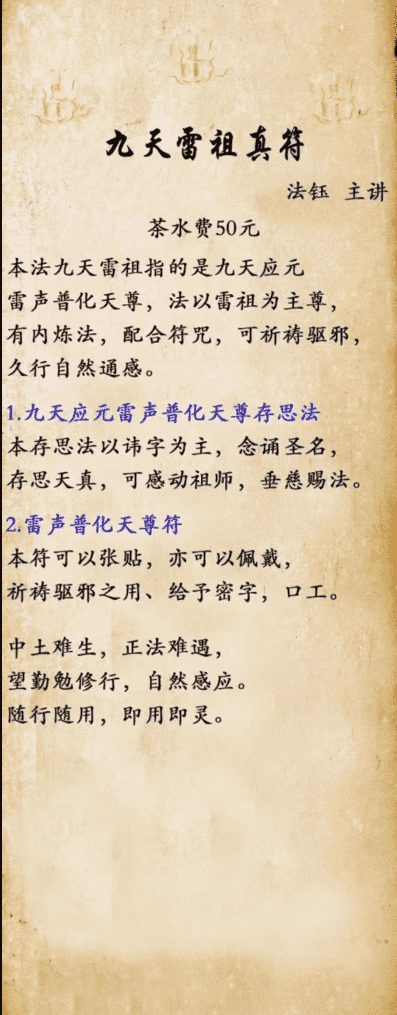 本法九天雷祖指的是九天应元雷声普化天尊,法以雷祖为主尊,有内炼法,配合符咒,可祈祷驱邪,久行自然通感。