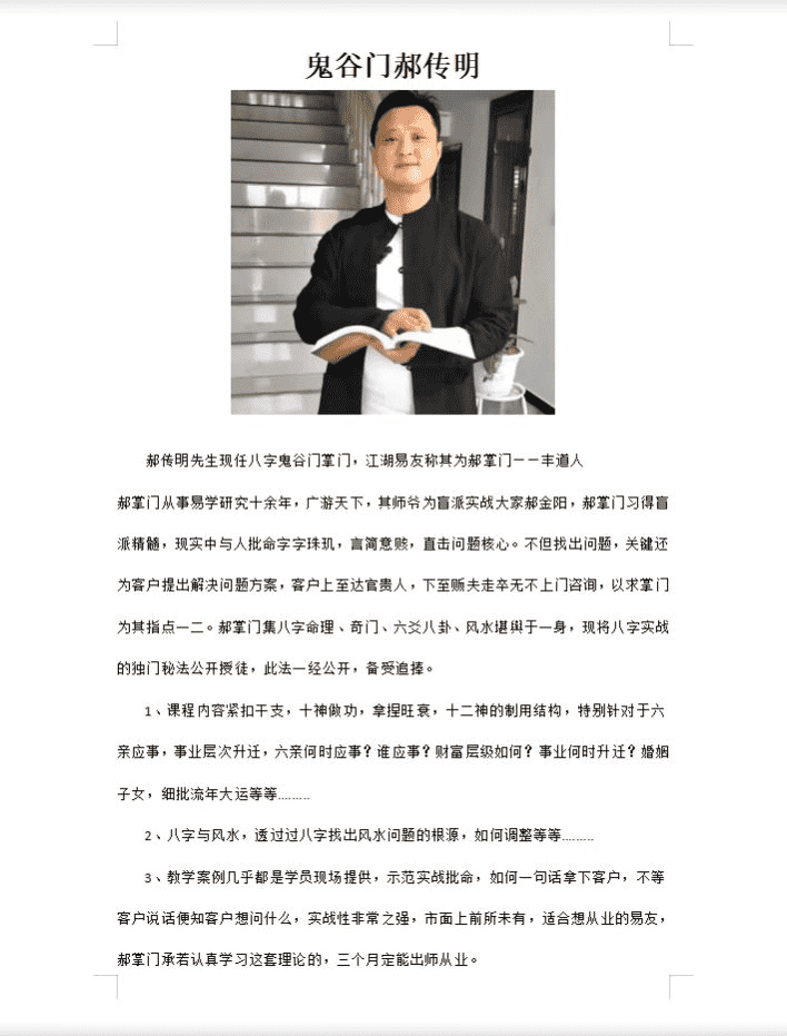 郝掌门事从易学研十究余年,广天游下,其师爷为盲派战实大家金郝阳,郝掌门习盲得派精髓,现实中与人批命字珠字玑,言意简赅,直击问核题心。不找但出问题,关键还为客户提解出决问题方案,客户至上达官贵人,下至夫贩走卒不无上门咨询,以求掌门为指其点一二。郝门掌集八字命理、奇门、六八爻卦、风水舆堪于一身,现将八字实战独的门秘法公开授徒,此法一经公开,备追受捧。