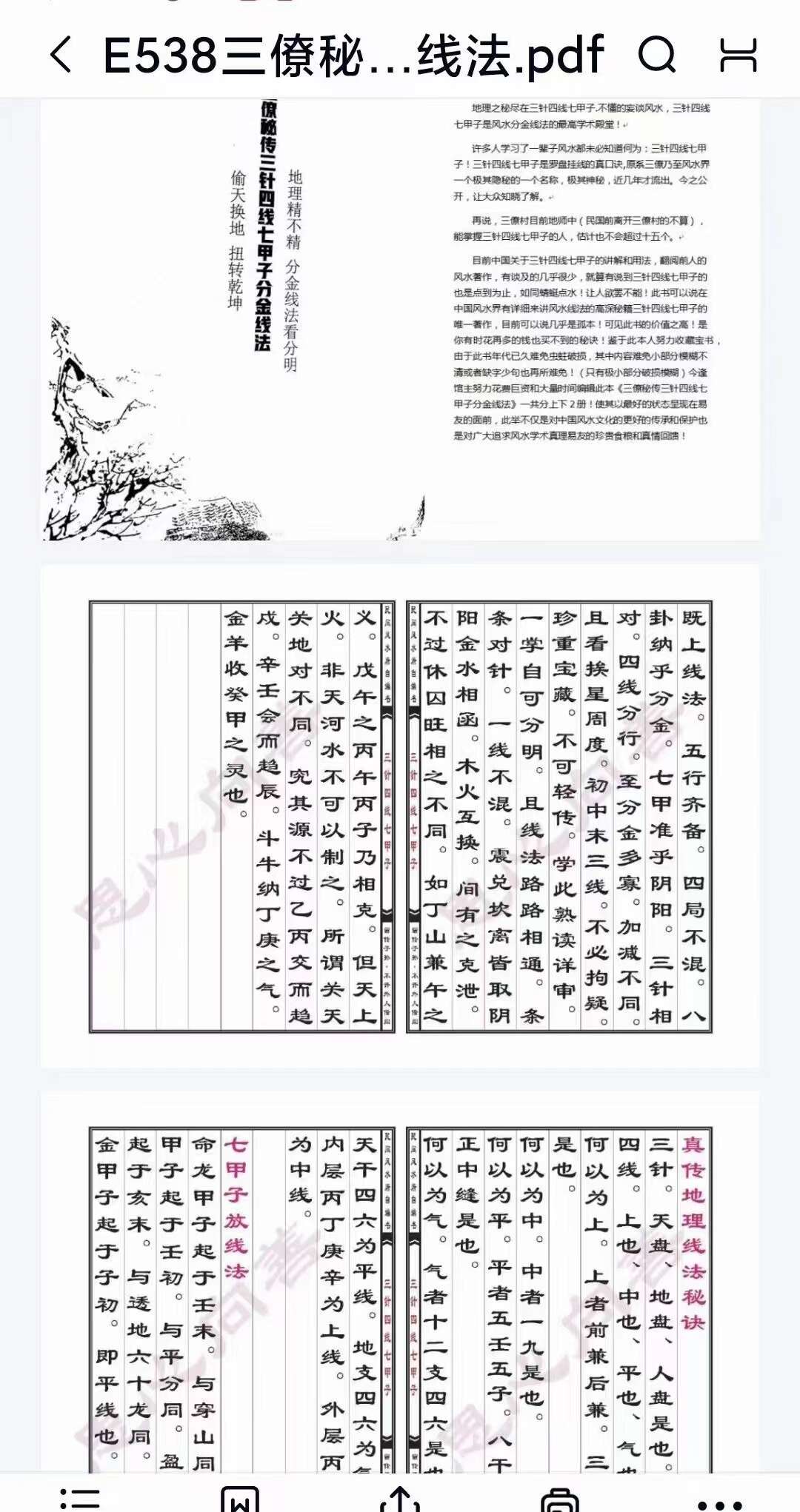 目前中国关于三针四线七甲子的讲解和用法,翻阅前人的风水著作,有谈及的几乎很少,就算有说到三针四线七甲子的也是点到为止,如同蜻蜓点水!让人欲罢不能!此书可以说在中国风水界有详细来讲风水线法的高深秘籍三针四线七甲子的唯一著作,目前可以说几乎是孤本!可见此书的价值之高!是你有时花再多的钱也买不到的秘诀.