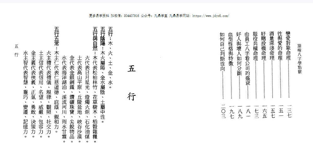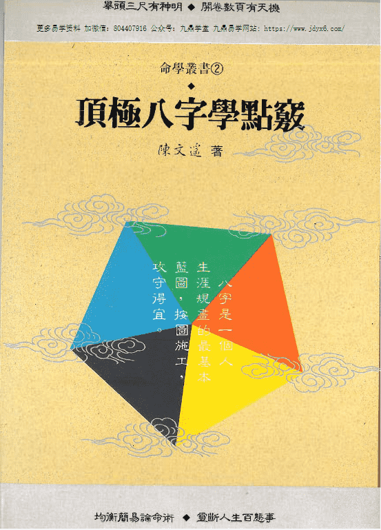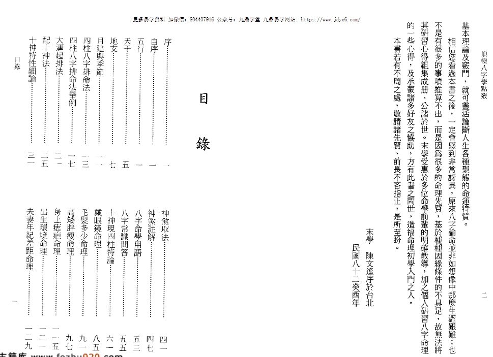 近年来八字命理学的「命运均衡论」又出现在新出版的命学丛书中,究其原因乃是天运正值 五术旺运,另一因素则是国际性经济严重衰退,造成大家亟寻应对之策、防范之道。中国人自古 以来,生活上每逢不如意或农业大欠收之年,通常都会去求神问卜,这问卜之道就是从阴阳五行 去推论得到预知或启示,取得应对之策,有所抉择,以待转机。基于前述之导向,五术就因应而 蓬勃发展,教授五术及学胄之人,有如雨后春笋;经过不少年后的今天,阴阳五行真正正确理论 何在?您是否已见识过?而且能够每发必中,确实掌握运用了呢?若答案不甚满意,那此书必能 满您所愿。 一般对五术很感兴趣的人,通常最初之接触都是始于书本,若是您坐拥书城之余,仍然无法 迅速有效的把握住重点,请试一试本书。本书采用均衡精简论命法,突破传统喜用神论命术,使 您能跳脱传统寞白的死胡同,节省宝贵的研习时间,不需要背记太多的资料,只要熟悉本书一些 基本理论及窍门,就可灵活论断人生各种型态的命运特质。 相信您看过本书之后,一定会感到非常讶异,原来八字论命并非如想像中那么生涩艰难;也 不是有很多的事项推算不出,而是因为很多的命理先贤,基于种种因缘条件的不具足,故无法将 其研习心得组集成册、公诸于世。末学受惠于多位命学前辈的明确教导,加之个人研习八字命理 的一些心得,及承蒙诸多好友之协助,方有此书之问世,造幅命理初学入门之人。 本书若有不周之处.敬请诸先贤、前长不吝指正,是所至盼。 朱学 陈文遥序于台北 民国八十二癸西年