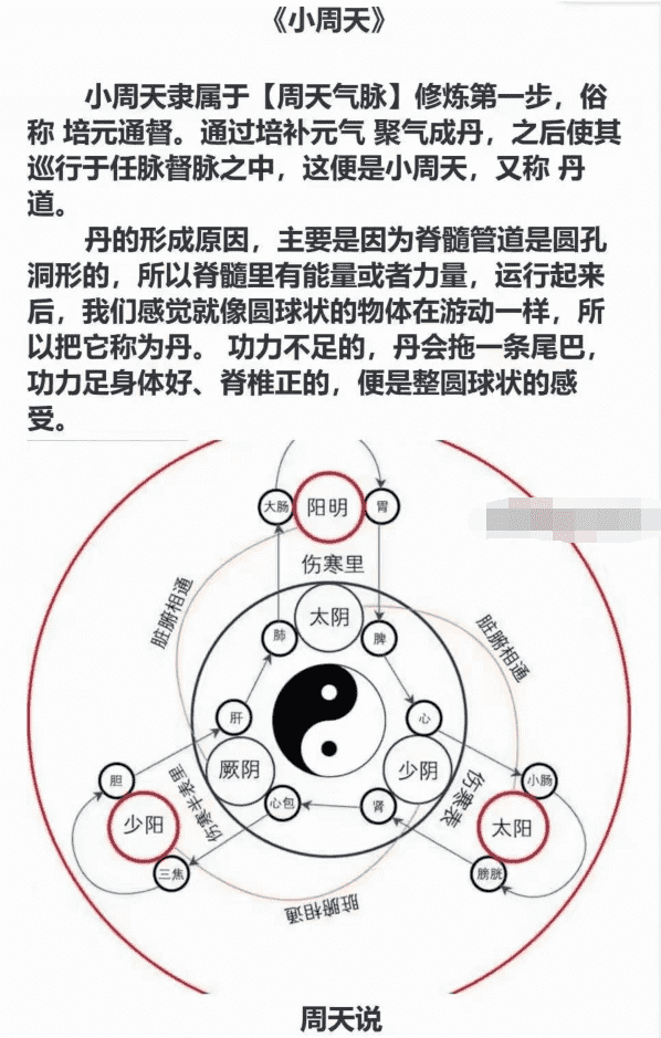 小周天隶属于【周天气脉】修炼第一步,俗称 培元通督。通过培补元气 聚气成丹,之后使其巡行于任脉督脉之中,这便是小周天,又称 丹道。