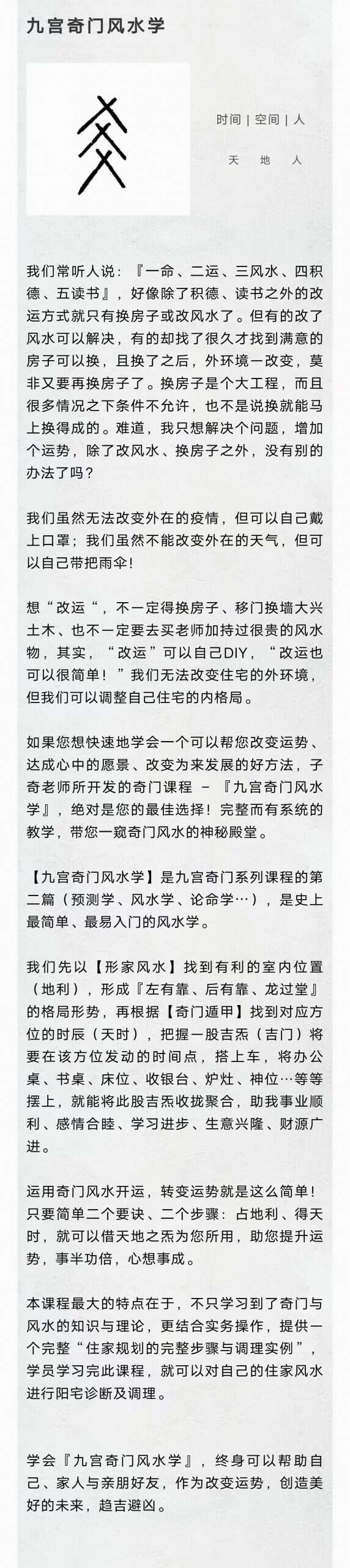 学会『九宫奇风门水学』,终身可以助帮自己、家与人亲朋好友,作改为变运势,创造美好未的来,趋吉避凶。