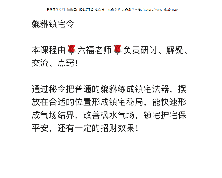通过秘令把普通的貔貅练成镇宅法器,摆放在合适的位置形成镇宅秘局,能快速形成气场结界,改善枫水气场,镇宅护宅保平安,还有一定的招财效果!