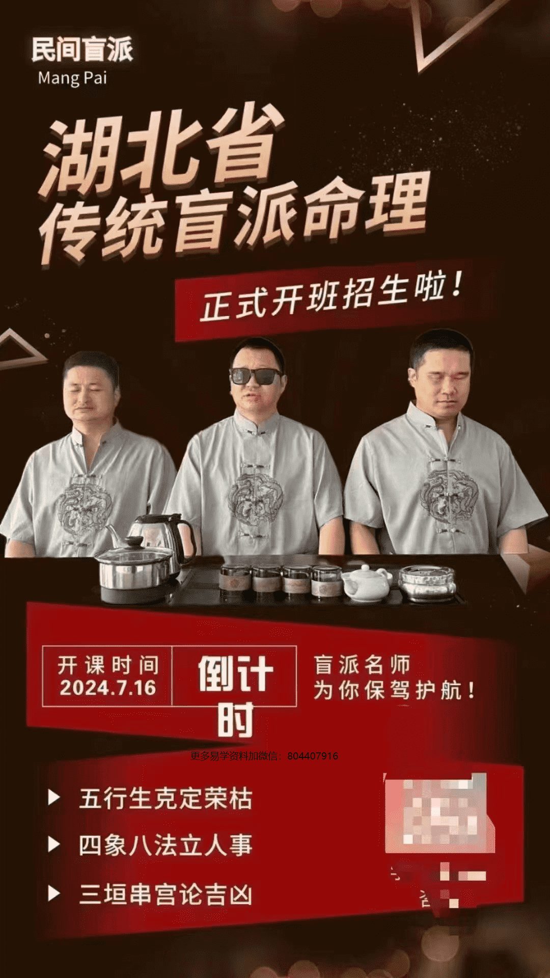 湖北省民间盲派侯师傅与其同门师兄弟龙师傅,任师傅,从事命理实战三十余年,在数以万计的实战预测中总结出了一套完整且实用的论命体系,将多年来盲派内部论命思路进行了系统性的总结