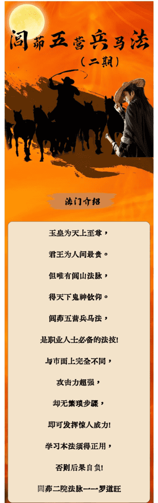 罗道旺闾茆五营兵马二期视频2集+法本。兵马指的是那些看不到的力量,指挥它们去做一些事情。至于功效,请自行判断,对于多数人来说大概了解一下就行,不是什么人都能玩这个,适合搞这个。