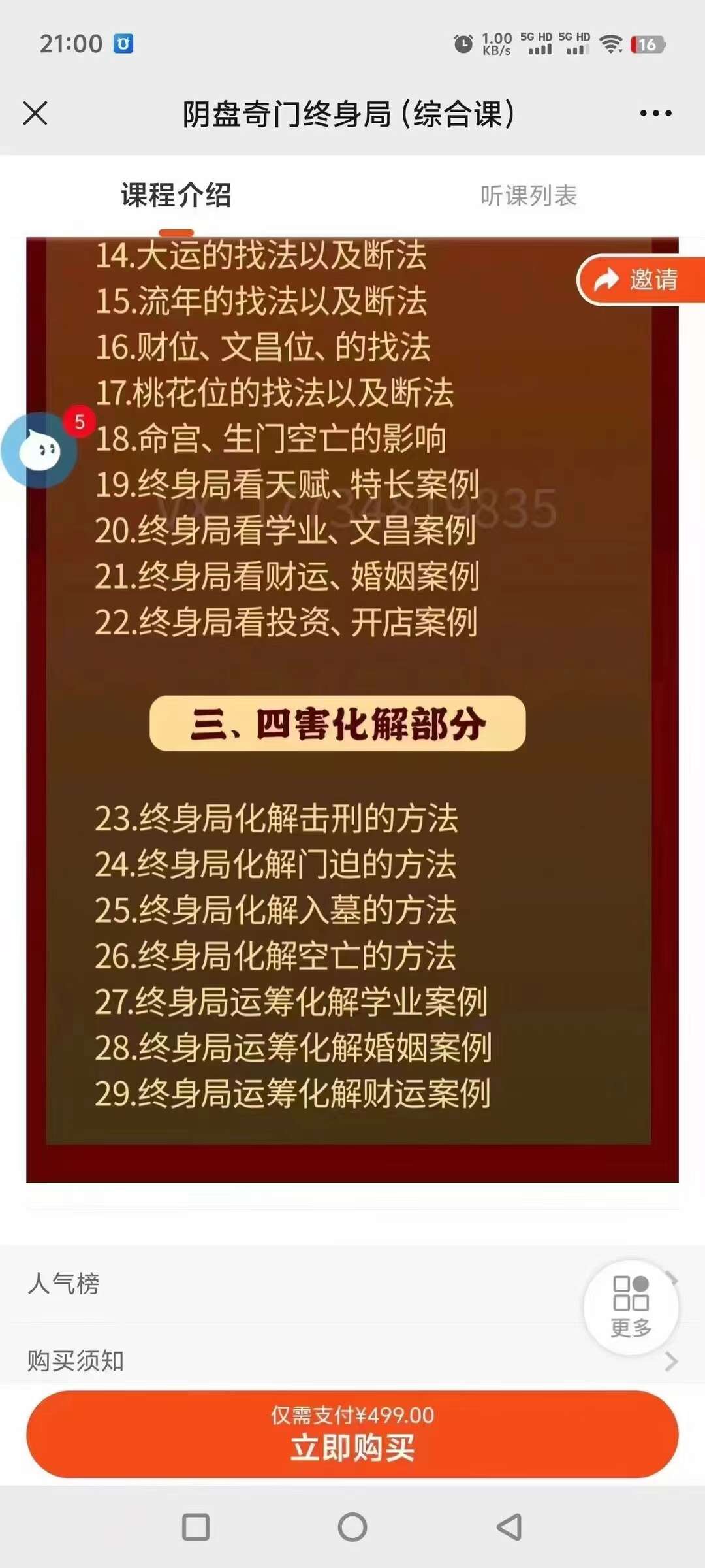 本课程我们从基础、预测、化解系统的讲解了终身局在我们一生中的运用,学完本课程即可会看自己的财运,事业,健康等等,你再也不用花大几千去找人解四害了,学完课程以及就会化解击刑、门迫、空亡、入墓,一人学会,全家受益,学完即可自己动手,帮助自己调理化解!