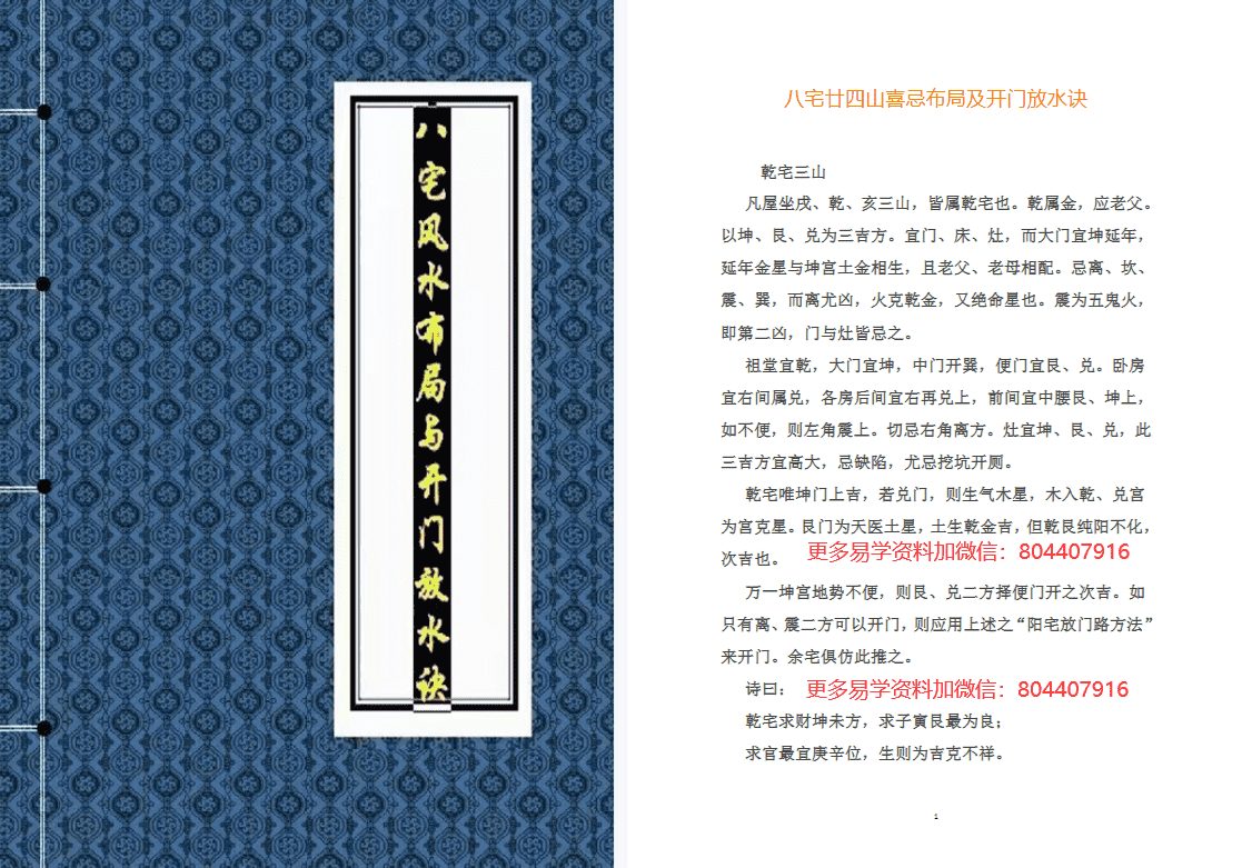 八宅风水廿四山喜忌布局及开门放水诀pdf,龙门一通著,约43页。内容不多,但都是八宅风水实际应用当中的一些诀窍和总结。