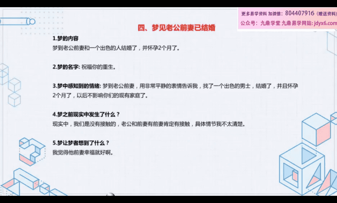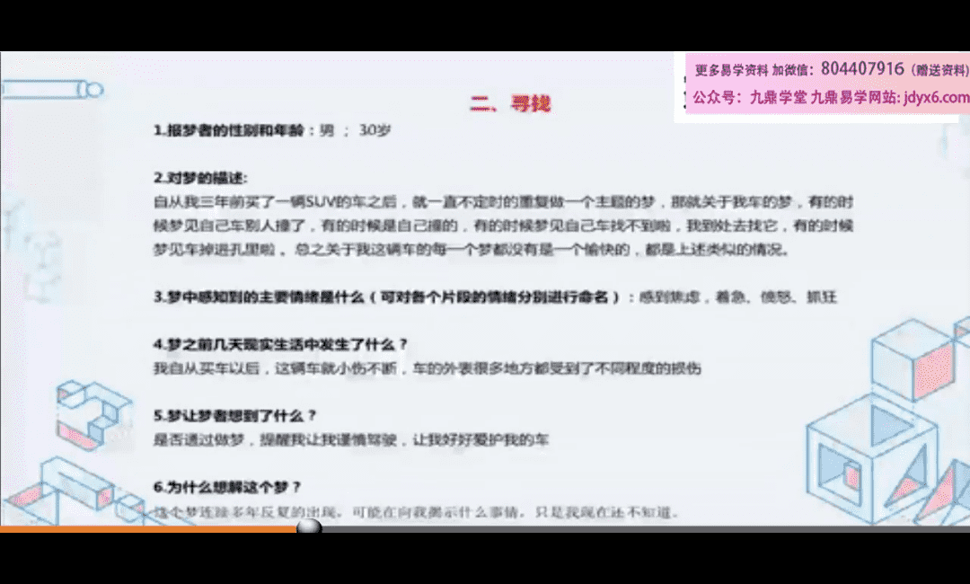 用心理学解梦7期视频,某心里学机构推出的心理学解梦讲座,对于研究解梦的朋友来说是一个不错的方向,梦不能老是朝着什么吉凶之类的去找答案,很多时候是心理活动自动演绎出来的梦境。