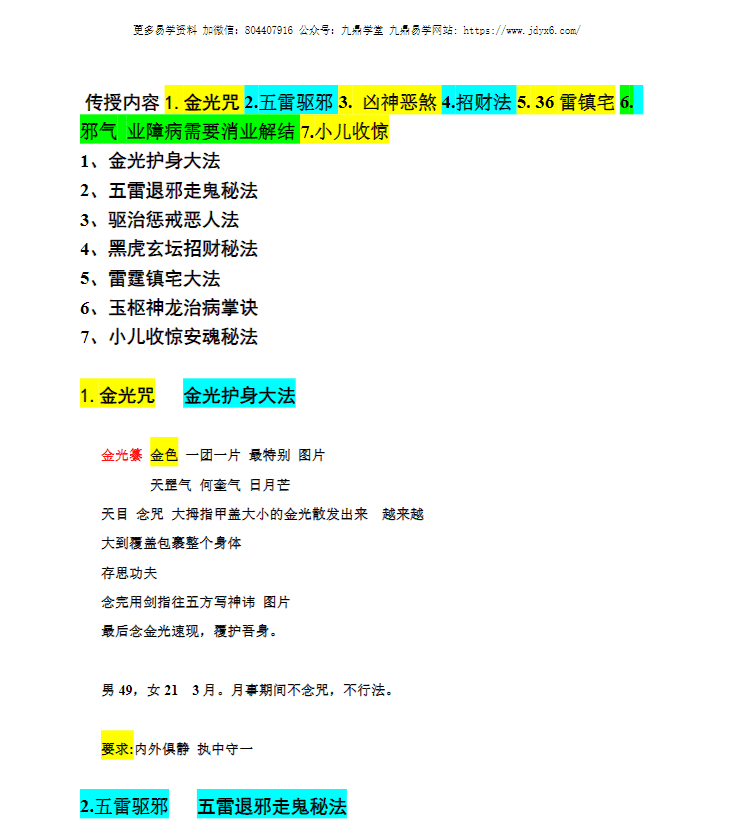 传授内容1.金光咒2.五雷驱邪3. 凶神恶煞4.招财法5. 36 雷镇宅6.