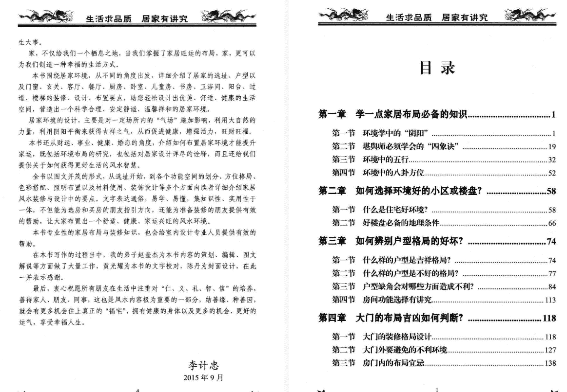 李计忠风水书籍-生活求品质 居家有讲究pdf,上下册,共724页。讲解住宅中的各个问题和需要注意的地方,是一本讲解形法的风水书籍,但涉及面多而广。教你如何选择小区,辨别户型格局好坏,大门,玄关,客厅,餐厅,厨房,卧室,卫生间,老人房和儿童房的设计,书房布局,阳台布局,过道和楼梯布局,家居色彩布局,灯光装饰等。