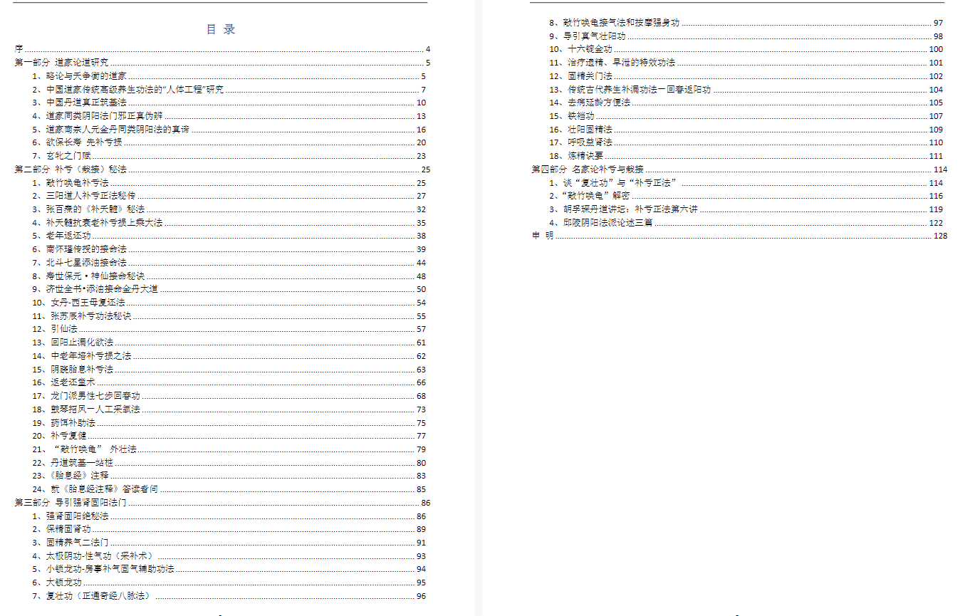 内容有:略论与争天衡的道家、中国道家传高统级养生功法的“人体工程”研究、中丹国道真正筑基法、敲竹龟唤补亏法、老年返还功、南瑾怀传授接的命法、北斗星七添油命接法、引仙法、强肾固阳秘绝法、十六金锭功、呼吸益肾等法等。