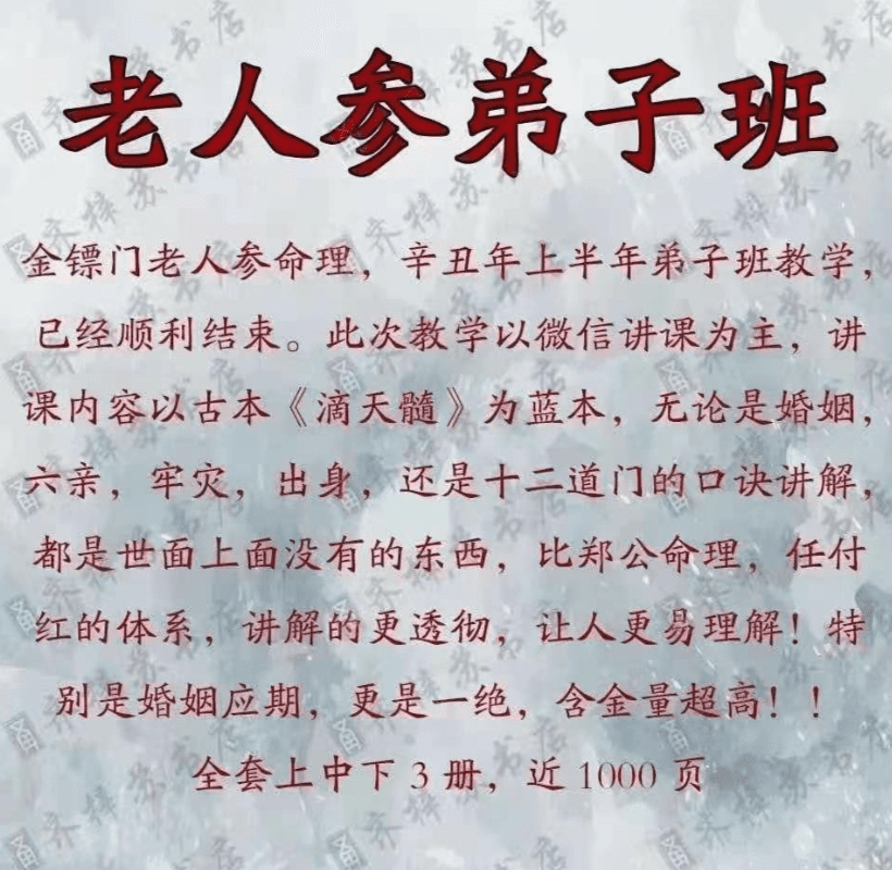 网络最热门的,辛丑年上半年【12—5月】弟子班教学,已经顺利结束。此次教学以微信讲课为主的,讲课内容以古本滴天髓为蓝本。讲课内容都是市面上闻所未闻的技法,无论是婚姻,六亲,牢灾,出身,还是十二道门的一些口诀讲解,都是世面上没有的东西,比郑公命理,任付红的体系,讲解的更透彻,让人更易理解!特别是婚姻应期,更是一绝,含金量超高!!仅此一项,就价值上万,绝对超值!!绝非一些大师一个星期的教学!全套上中下3册,近1000页!注意原版容量比较大,我们搞了个压缩版和原版,方便网友下载阅读,据说是目前现代命理界含金量最高的命理著作。