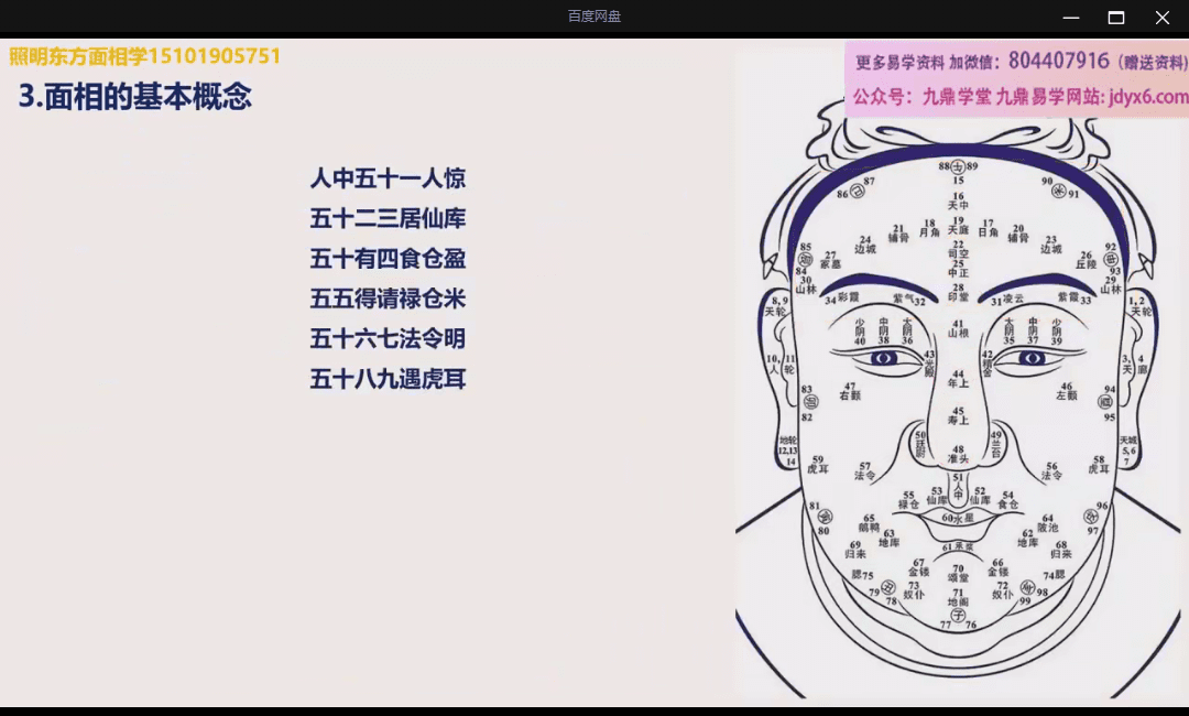 照明居士识人术高级班视频28集,讲解面相各部位的各种看法,也有部分痣相,手相和头像类的看法。讲解时间长,每集近一小时或者大于一小时。