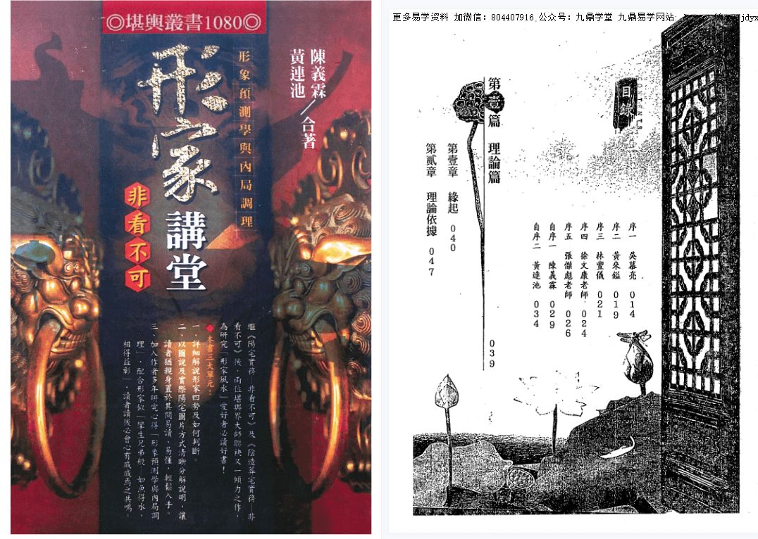 陈义霖、黄连池《形家讲堂非看不可》PDF 347页。讲解形家风水,只讲阳宅的各种外形所带来的诱导。