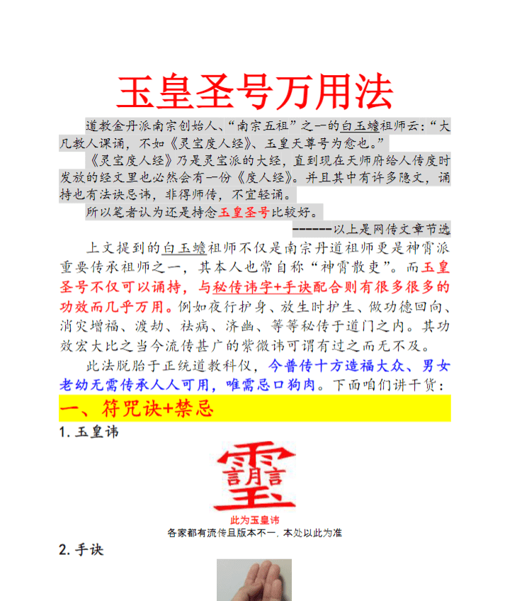 玉皇圣号万用法pdf 10页,可用于护身,渡劫,祛病,增福等。