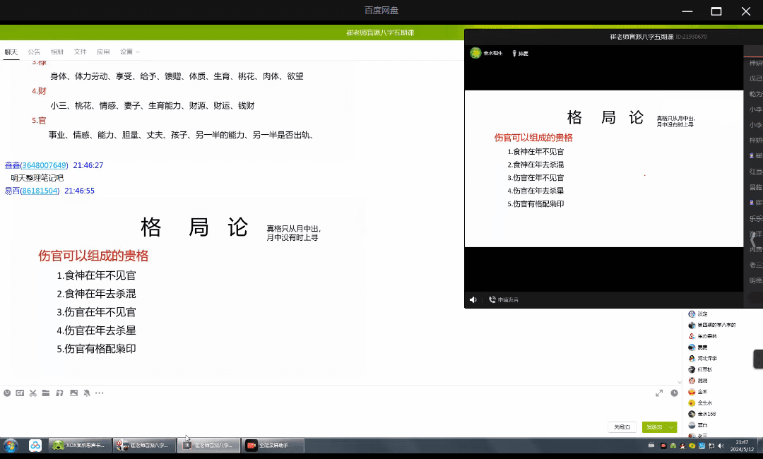二、初级课程:打开八字找格局、找做功,做功方式种类、分别出现生活中的状态和现象、体与用、体与体,用与用,分别代表生活中的人物、事物现象、应用在流年大运时间应期的方法。