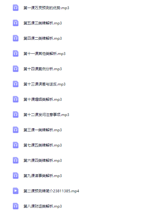 万灵预测班录音14集,仅有一集视频,且也只是一个简介说明,所以基本都算是录音了,以卡牌形式进行预测。
