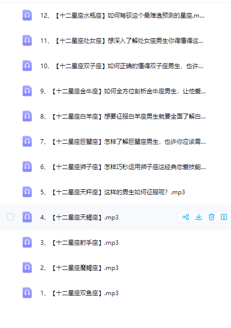 十二星座恋爱秘籍音频讲座12集,每集讲解十多分钟。