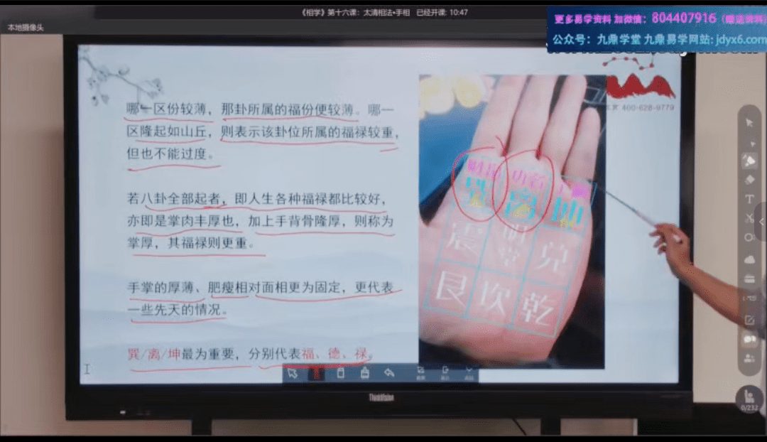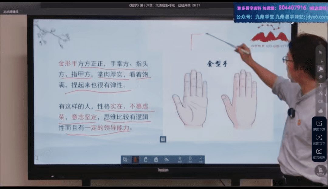 这套周泽云老师的相学课,从最基础的“三庭五官”讲起,带你一步步扎进老祖宗的识人智慧里。19集主课像剥洋葱似的层层深入:先带你看懂脸型格局(五星六曜怎么定格局强弱)、五官玄机(比如“宝寿官”管健康根基、“监察官”藏性格脾气),再拆解面相十二宫的秘密——命宫宽窄预示心胸大小,印堂一指半才是黄金比例;接着教你用十三部位推流年运势,看透事业起伏的关键转折;最后落到气色神韵、骨相动静这些硬功夫上,连手纹走势都给你盘得明明白白。