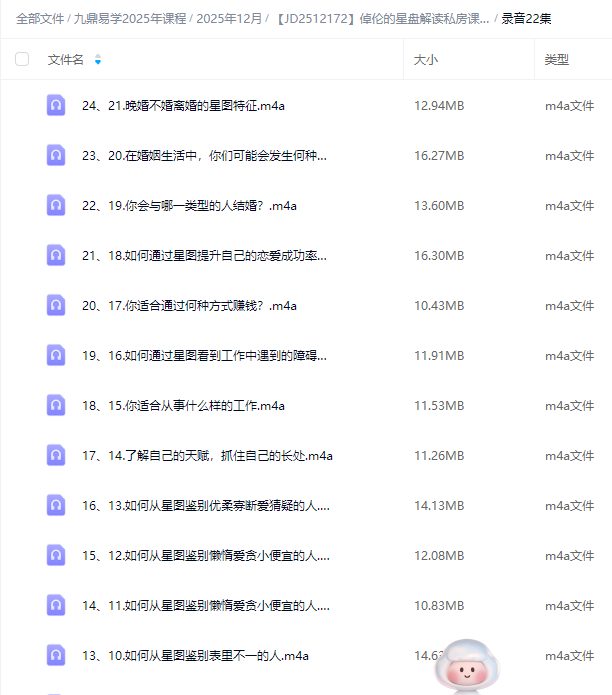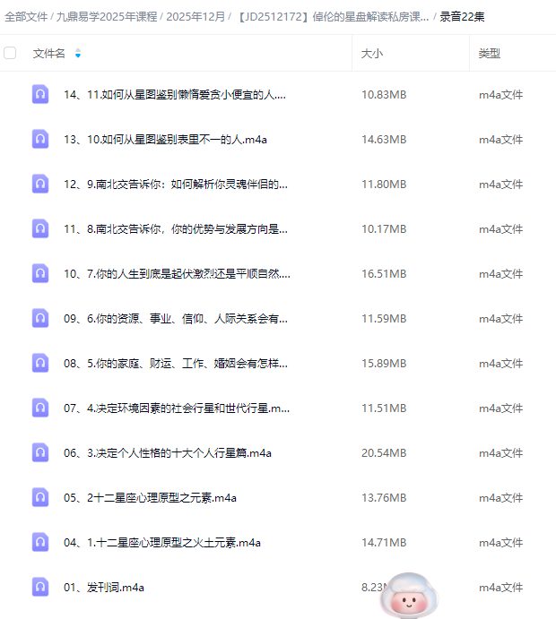 倬伦的星盘解读私房课:剖析自己,找到正能量和合拍的人事物音频+视频2集。可以默认都是音频,因为正课都是音频讲解星盘课