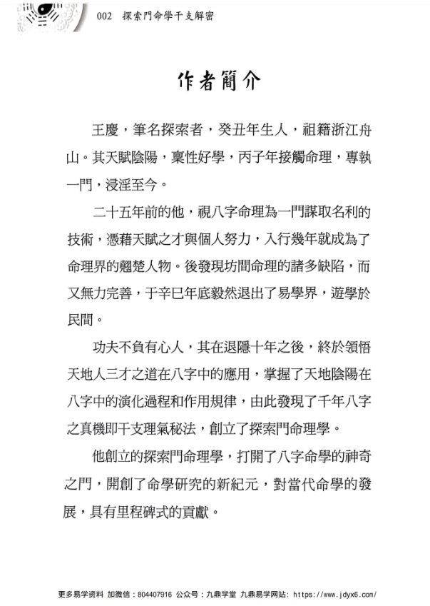 探索门命学干支解密.pdf 王庆 313页。老九推荐命理爱好者可以看看,王庆老师的命理书籍,尤其是近几年的是很有深度的,便于提取信息和锁定矛盾点,是传统命学,但比传统书籍更容易让人看懂。