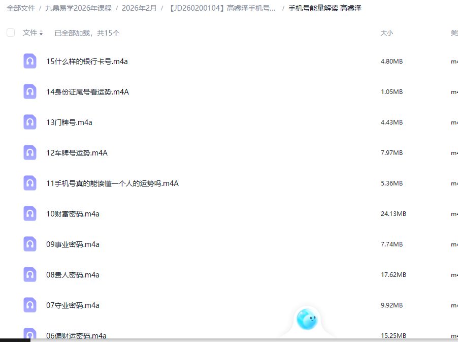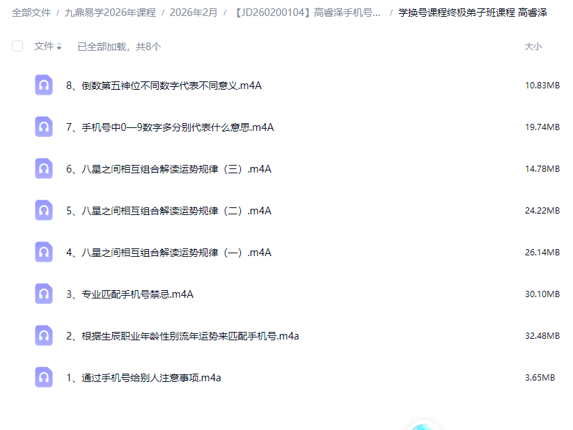 高睿泽手机号码和手机换号弟子班两套音频课,两套22集录音,讲解手机号码的秘密和换号的方法,每集几分钟到半小时不等